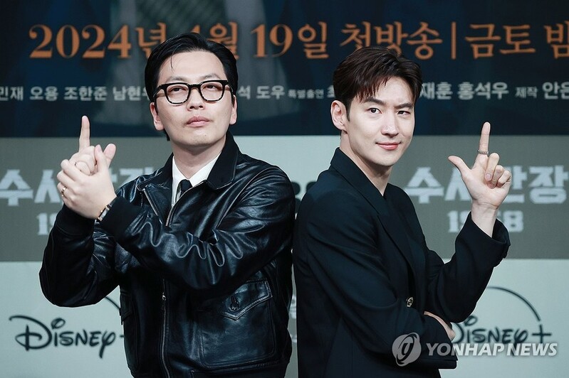| ▲ '우리가 바로 수사반장' (서울=연합뉴스) 진연수 기자 = 배우 이제훈(오른쪽)과 이동휘가 18일 오후 서울 마포구 MBC 골든마우스홀에서 열린 MBC 새 금토드라마 '수사반장 1958' 제작발표회에서 포즈를 취하고 있다. 2024.4.18 jin90@yna.co.kr |