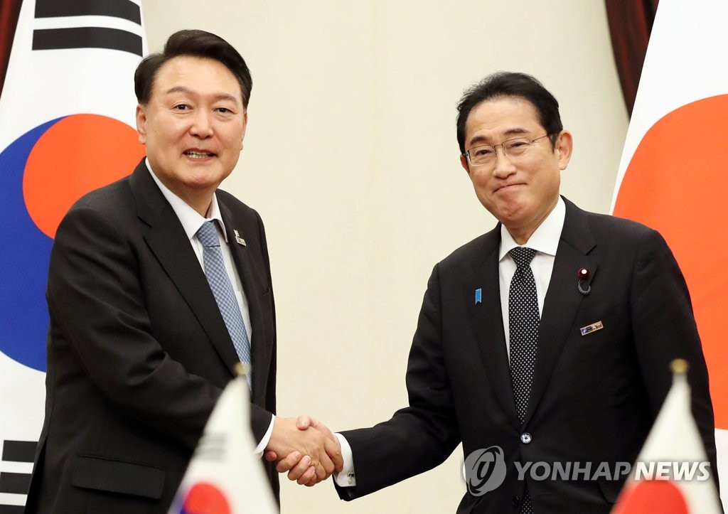 | ▲ 리투아니아에서 만난 한일 정상 (빌뉴스[리투아니아]=연합뉴스) 임헌정 기자 = 북대서양조약기구(NATO·나토) 정상회의 참석차 리투아니아를 방문 중인 윤석열 대통령이 7월 12일(현지시간) 빌뉴스 한 호텔에서 열린 한일 정상회담에서 기시다 후미오 일본 총리와 악수하고 있다. [연합뉴스 자료사진] |