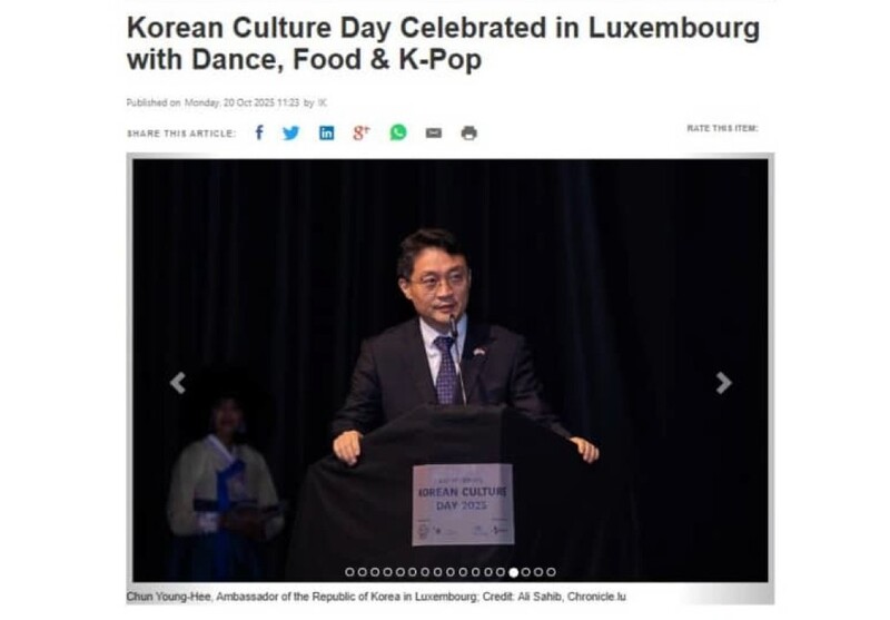 ▲ This image, captured from the website of Luxembourg-based Chronicle.lu, shows South Korean Ambassador to Luxembourg Chun Young-hee speaking during the Korean Culture Day event on Oct. 18, 2025 (local time), as provided by the foreign ministry in Seoul. (PHOTO NOT FOR SALE) (Yonhap)