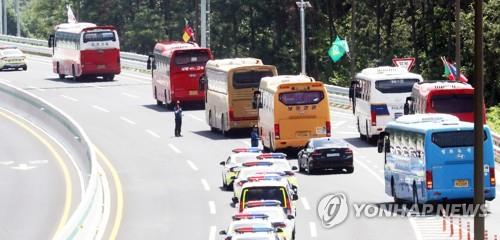 A total of 1,014 buses, escorted by 273 police patrol cars and four helicopters, transported the jamboree participants to 128 new accommodations in eight cities and provinces, including Seoul, Incheon, 27 kilometers west of the capital, and Gyeonggi Province, which surrounds the capital.