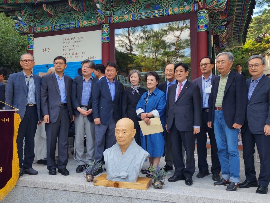 ▲ 무산선원에 모인 문화예술인들 (서울=연합뉴스) 양정우 기자 = 19일 서울 북악산 자락에 무산선원이 개원했다. 이 선원은 문화예술인들의 소통공간이자 2018년 입적한 '무애(無碍)도인' 무산스님의 화합과 상생 정신을 선양하는 곳이다. 한자리에 모인 문화예술인들이 기념사진에 응하고 있다. 2022.9.19 eddie@yna.co.kr (끝)