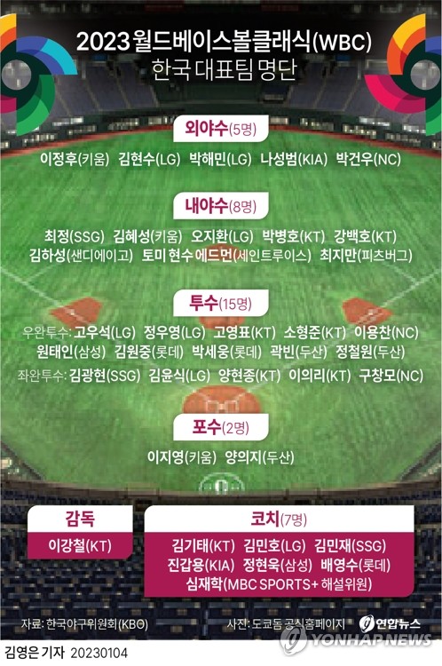 | ▲ [그래픽] 2023 월드베이스볼클래식(WBC) 한국 대표팀 명단 (서울=연합뉴스) 김영은 기자 = 한국야구대표팀이 '빅리그 내야 라인'을 꾸려 2023 월드베이스볼클래식(WBC)에 나선다.