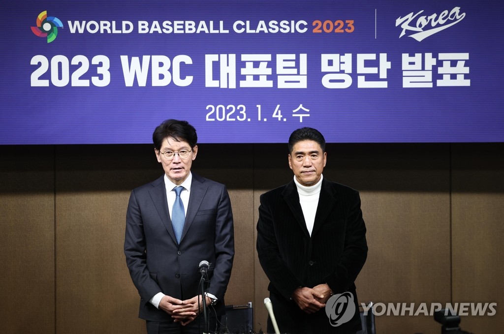 | ▲ WBC 야구대표팀 명단 발표 (서울=연합뉴스) 김인철 기자 = 4일 오후 서울 강남구 야구회관에서 이강철 야구대표팀 감독과 조범현 기술위원장이 2023 월드베이스볼클래식(WBC)에 출전하는 한국 야구대표팀 선수 명단을 발표하고 있다. 2023.1.4 yatoya@yna.co.kr |