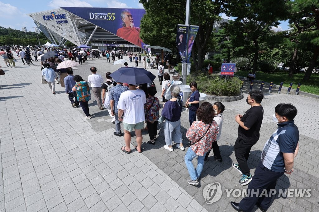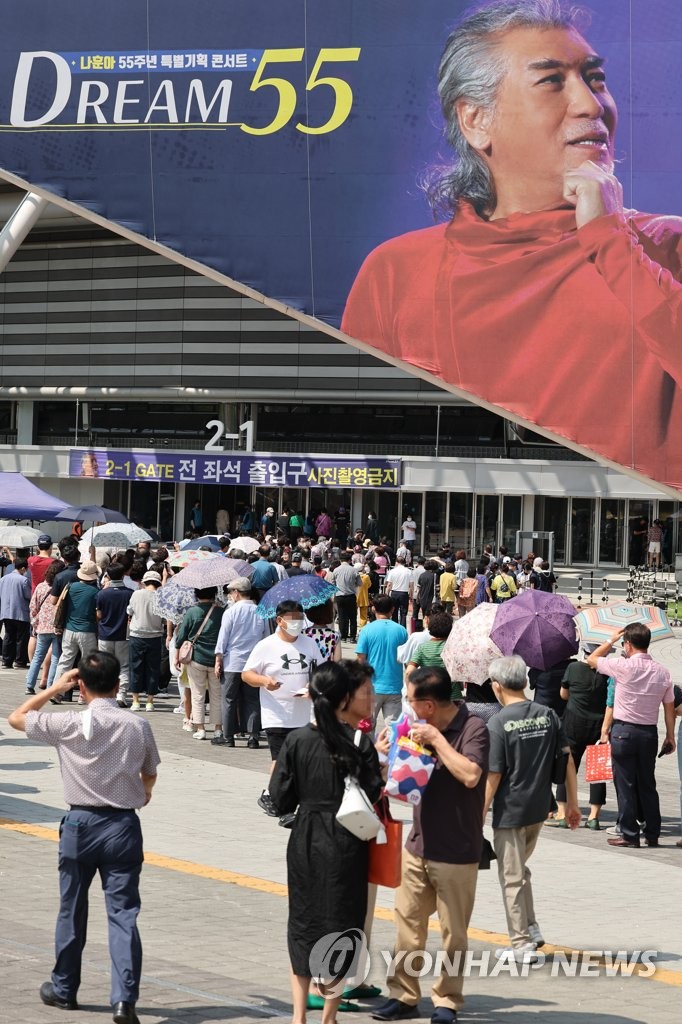 | ▲ 나훈아 콘서트 인파 (서울=연합뉴스) 임화영 기자 = 20일 오후 서울 올림픽체조경기장에서 열린 2022년 'Dream 55' 나훈아 콘서트를 찾은 관람객들이 입장을 위해 줄을 서 있다. 2022.8.20 hwayoung7@yna.co.kr |