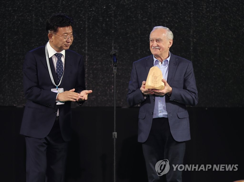 | ▲ 울주세계산악문화상 받은 크시스토프 비엘리츠키 1일 오후 울산시 울주군 영남알프스 복합웰컴센터에서 열린 제7회 울주세계산악영화제 개막식에서 울주세계산악문화상 수상자인 폴란드 산악인 크시스토프 비엘리츠키가 이선호 이사장으로부터 상패를 받고 기념 촬영하고 있다. 울주세계산악문화상은 산악문화 발전에 기여한 공로가 큰 인물에게 시상된다. [연합뉴스 자료사진] |