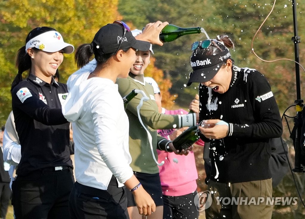 | ▲ 리디아 고, BMW 레이디스 챔피언십 우승 (서울=연합뉴스) 뉴질랜드 교포 리디아 고가 23일 강원도 원주 오크밸리 컨트리클럽에서 열린 대회 4라운드까지 최종합계 21언더파 267타를 기록, 우승한 뒤 동료 선수들의 축하를 받고 있다. 2022.10.23 [BMW 코리아 제공. 재판매 및 DB 금지] photo@yna.co.kr |