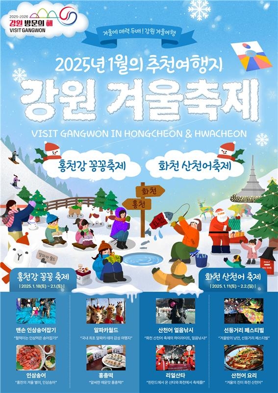 (춘천=연합뉴스) 이재현 기자 = 강원도와 강원관광재단은 '2025∼2026년 강원 방문의 해' 1월의 추천 여행지로 화천 산천어축제와 홍천강 꽁꽁축제를 추천했다고 21일 밝혔다.