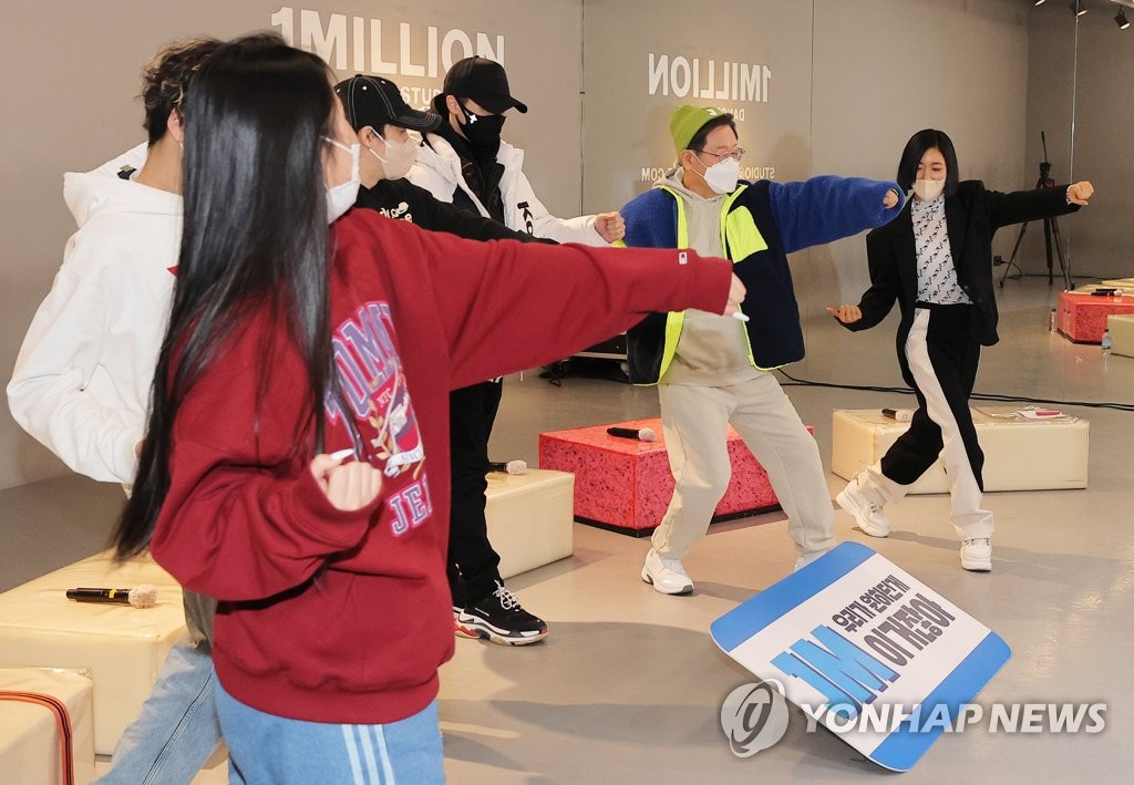 | ▲ 춤동작 배우는 이재명 (서울=연합뉴스) 더불어민주당 이재명 대선 후보가 20일 서울 성동구 원밀리언 댄스 스튜디오에서 'JM, 우리가 원하던게 이거잖아 - 리아킴, 백구영, 영제이, 시미즈, 하리무, 루트와의 만남'을 갖고 댄서들에게 춤동작을 배우고 있다. 2022.1.20 [국회사진기자단] uwg806@yna.co.kr |