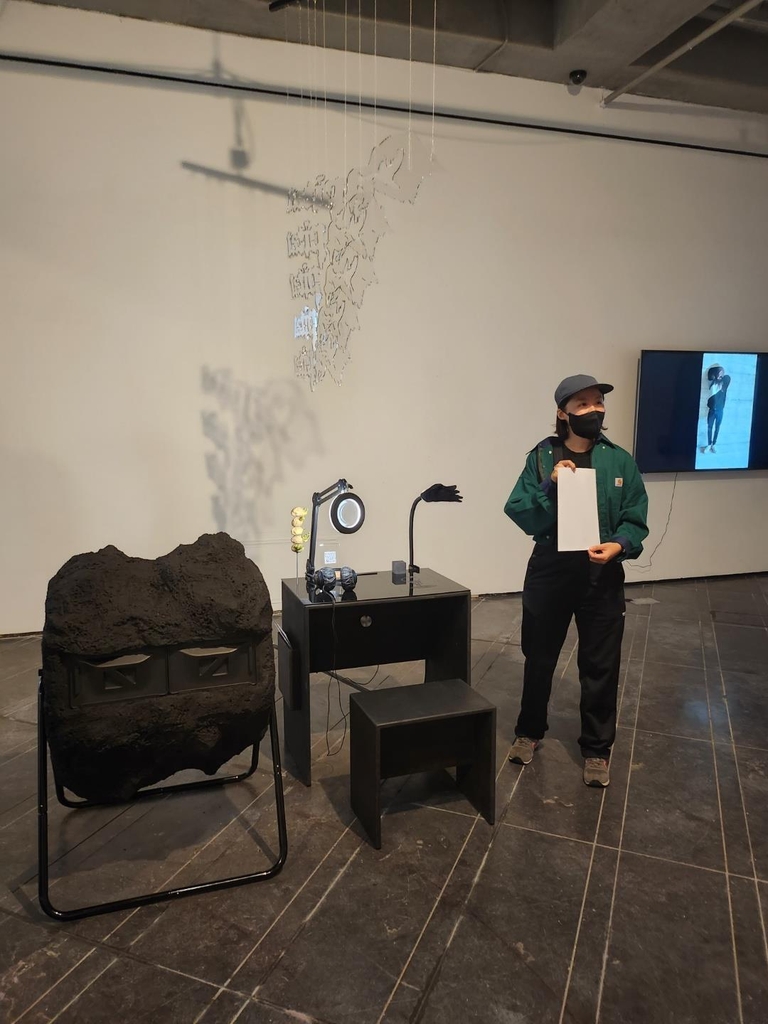 | ▲ 대안공간 루프의 '자매들, 우리는 커진다': 서울-샌프란시스코 교류전' (서울=연합뉴스) 김경윤 기자 = 대안공간 루프는 23일부터 에코페미니즘을 중심으로 '자매들, 우리는 커진다': 서울-샌프란시스코 교류전'을 개최한다. 사진은 참여형 작품을 설명하는 권은비 작가. 2022.9.23 heeva@yna.co.kr |