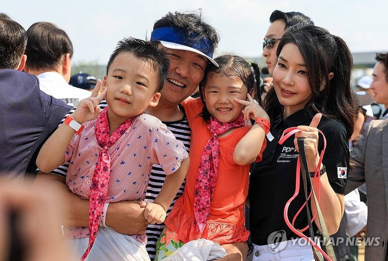 ▲ First lady Kim Keon Hee (R) poses with children during an event held for families with multiple children at Yongsan Children's Garden near the presidential office in Seoul on Aug. 26, 2023, in this photo provided by the office. (PHOTO NOT FOR SALE) (Yonhap)