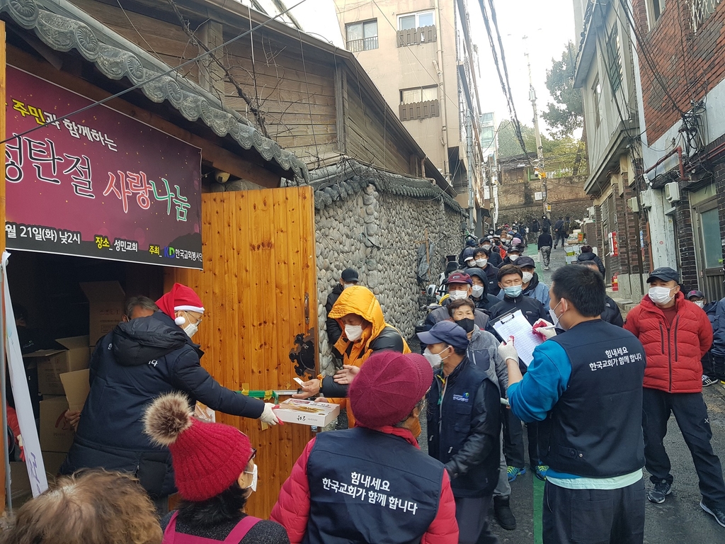 ▲ 한국교회봉사단은 21일 서울 용산구 동자동을 찾아 '동자동 주민과 함께하는 성탄절 나눔행사'를 열었다고 22일 밝혔다. 동자동 성민교회 앞 거리에서 연 행사에서 쪽방촌 주민들에게 참치캔 선물 세트 500개를 나눠줬다. (서울=연합뉴스)