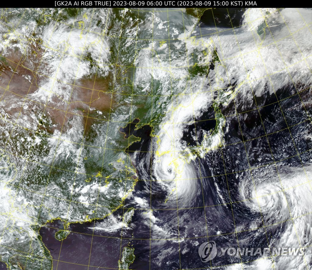 | ▲ 태풍 카눈의 9일 15시 현재위성 영상 (서울=연합뉴스) 진성철 기자 = 한반도로 접근 중인 제6호 태풍 카눈의 9일 15시 현재 위치를 보여주는 천리안위성 2A호의 위성 영상. 2023.8.9 [국가기상위성센터 제공. 재판매 및 DB 금지] zjin@yna.co.kr |