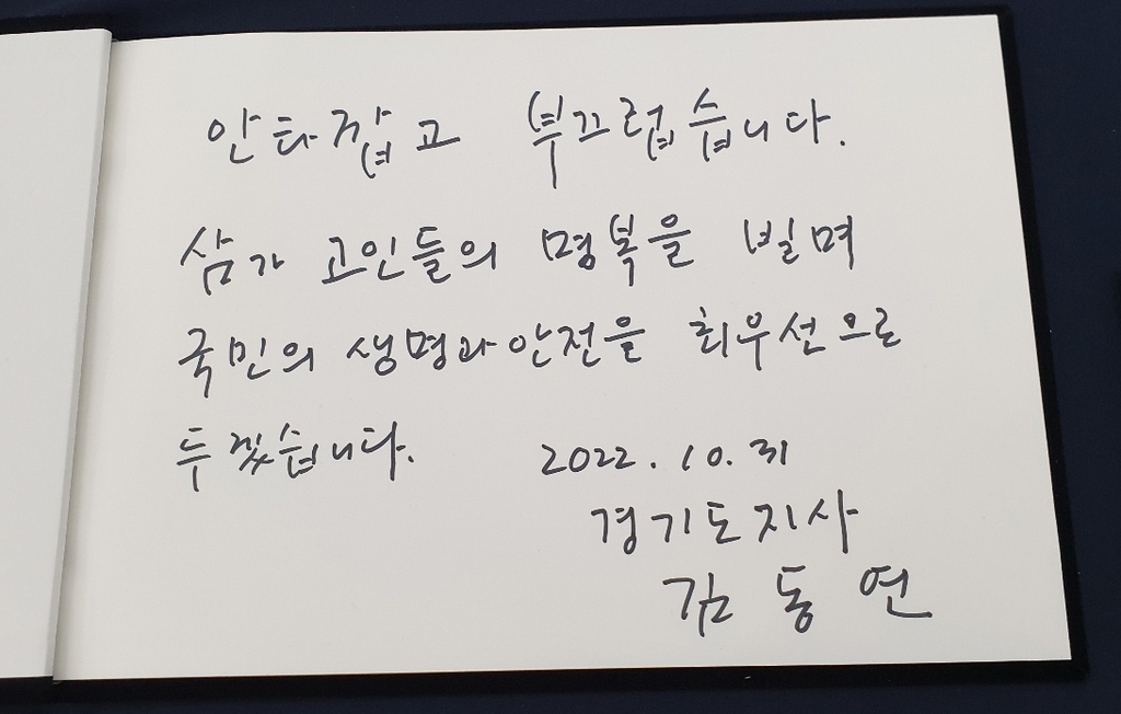 김동연 지사는 분향소 설치 직후인 이날 오후 5시55분께 아내 정우영 씨와 함께 헌화한 뒤 조문록에 '안타깝고 부끄럽습니다. 삼가 고인들의 명복을 빌며 국민의 생명과 안전을 최우선으로 두겠습니다'고 적었다.