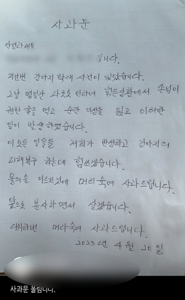 A씨는 논란이 되자 포털 식당 소식란에 사과문을 올려 "며칠간 과로로 인해 힘든 상황에서 손님이 권한 술을 먹고 순간 이성을 잃어 이런 일이 발생했다"며 "이 모든 일을 반성하고, 강아지의 피해복구를 위해 힘쓰겠다. 봉사하며 살겠다"고 했다.
