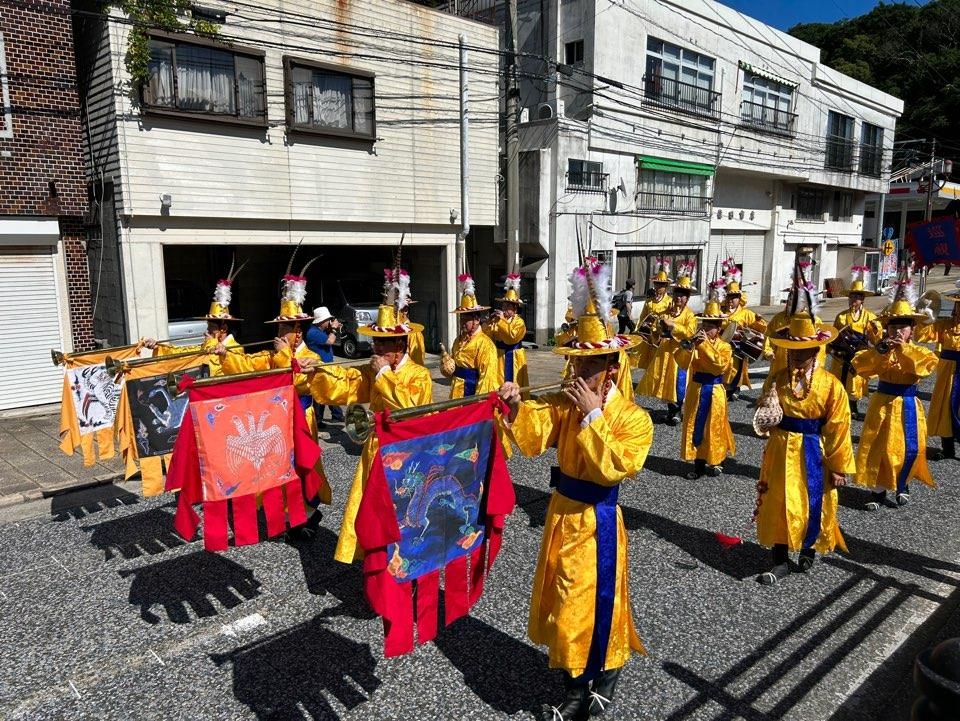 (쓰시마=연합뉴스) 김예나 기자 = 항구에 정박 중이던 배 앞으로 노란 옷에, 노란 모자까지 갖춰 쓴 취타대가 하나둘 모여들었다.