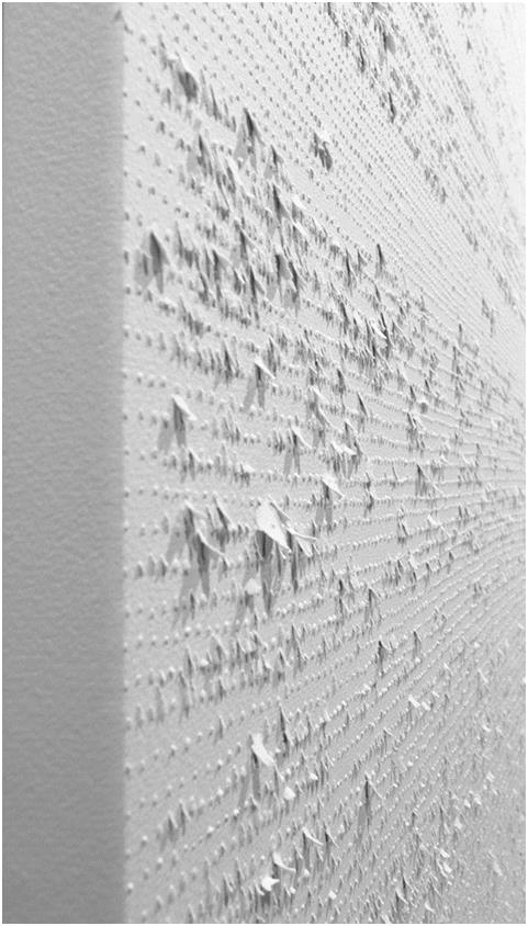 이번 전시에서는 순백의 화폭을 바늘이나 실, 송곳 등으로 뚫거나 긁어 점과 선의 흔적을 만들어 낸 작품들을 선보인다.