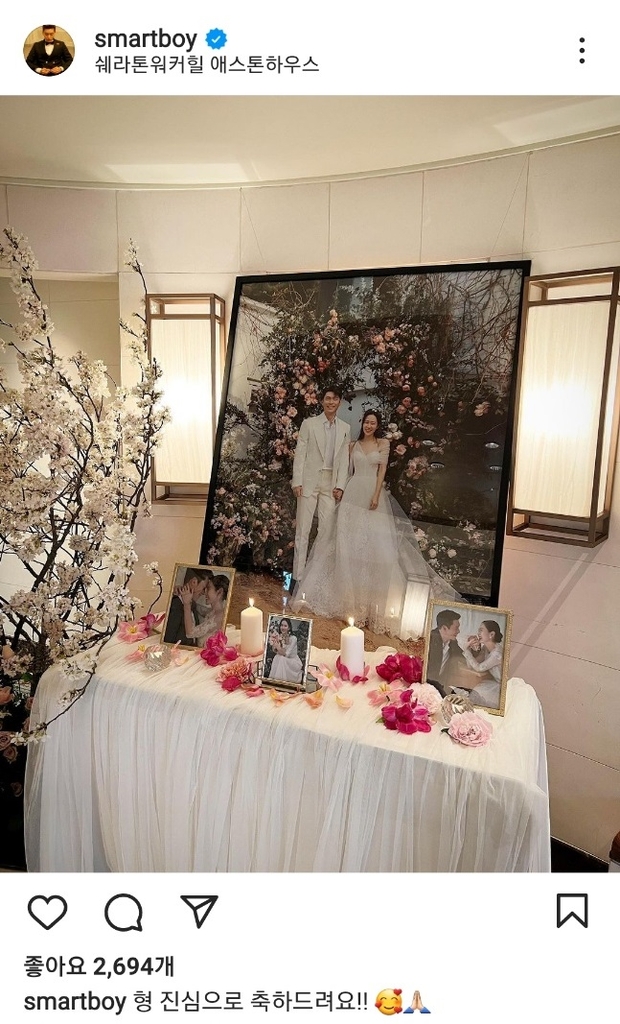 현빈과 예능에서 만나 인연을 맺은 배우 최성준은 이날 "형 진심으로 축하드려요"라며 웨딩 사진이 걸린 포토 테이블 사진을 인스타그램에 올렸다.