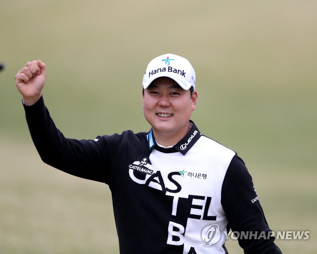 ▲ 세리머니 하는 함정우 (서울=연합뉴스) 16일 강원도 오크벨리CC에서 열린 제16회 DB손해보험 프로미오픈 2라운드 9번 홀에서 함정우가 버디 성공후 세리머니를 하고 있다. 2021.4.16 [KPGA 제공. 재판매 및 DB 금지] photo@yna.co.kr