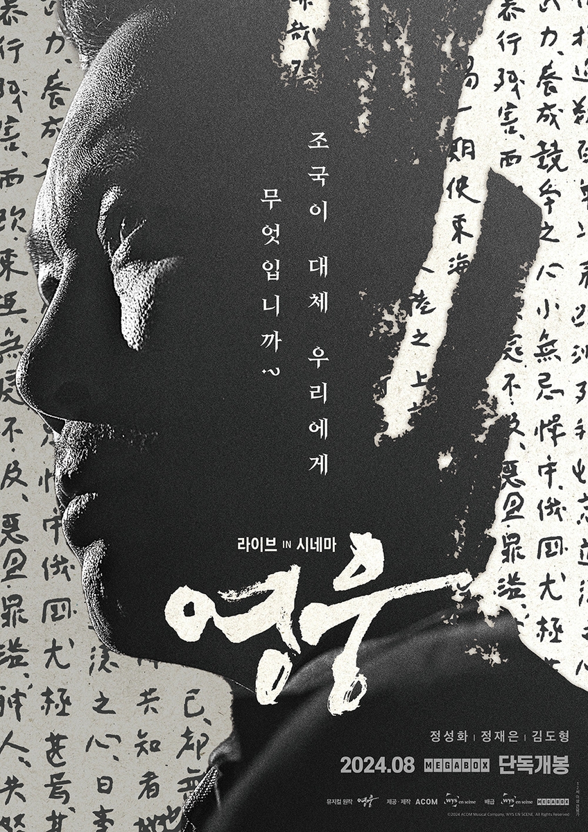 (서울=연합뉴스) 오보람 기자 = 안중근 의사의 마지막 1년을 다룬 뮤지컬 '영웅'의 실황 영화 '영웅: 라이브 인 시네마'가 다음 달 21일 메가박스에서 단독 개봉한다고 제작사 위즈온센이 29일 밝혔다.
