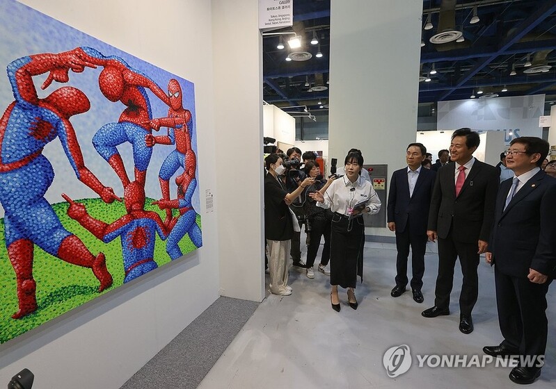 | ▲ 키아프 서울 전시 둘러보는 오세훈 시장-박보균 문체부 장관 오세훈 서울시장과 박보균 문화체육관광부 장관이 6일 서울 강남구 코엑스에서 열린 키아프 서울에서 전시장을 순회하며 작품을 살펴보고 있다.[연합뉴스 자료사진] |