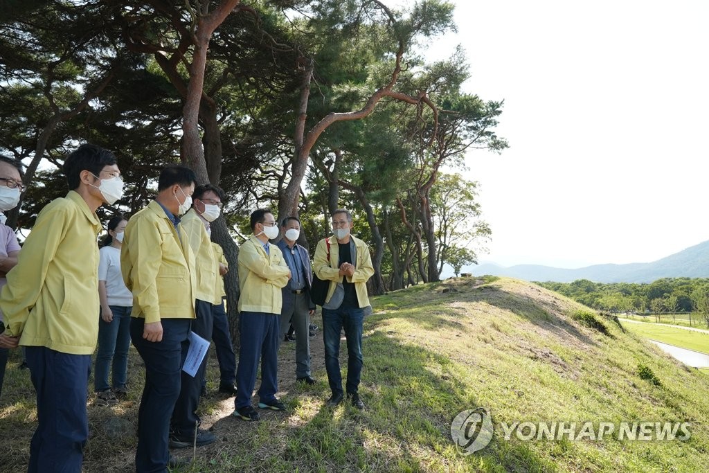 ▲ 경주 월성 점검하는 강경환 차장 (서울=연합뉴스) 강경환 문화재청 차장(오른쪽 세 번째)이 7일 오후 경북 경주시에 위치한 사적 경주 월성을 방문해 제11호 태풍 힌남노로 유실된 남쪽 성벽 현장을 점검하고 있다. 2022.9.7 [문화재청 제공. 재판매 및 DB 금지] photo@yna.co.kr