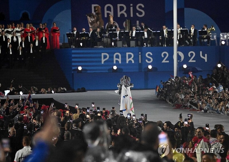 ▲ 참가국 국기와 입장하는 오륜기 (파리=연합뉴스) 김도훈 기자 = 2024 파리올림픽 개회식이 열린 26일 오후(현지시간) 이에나 다리에 도착한 오륜기가 올림픽 참가국 국기와 함께 트로카데로 행사장으로 입장하고 있다. 2024.7.27 hkmpooh@yna.co.kr