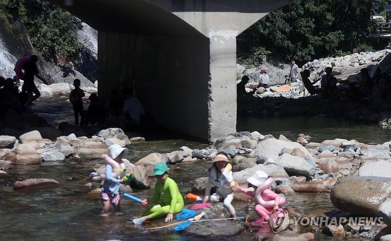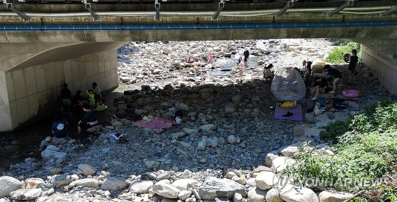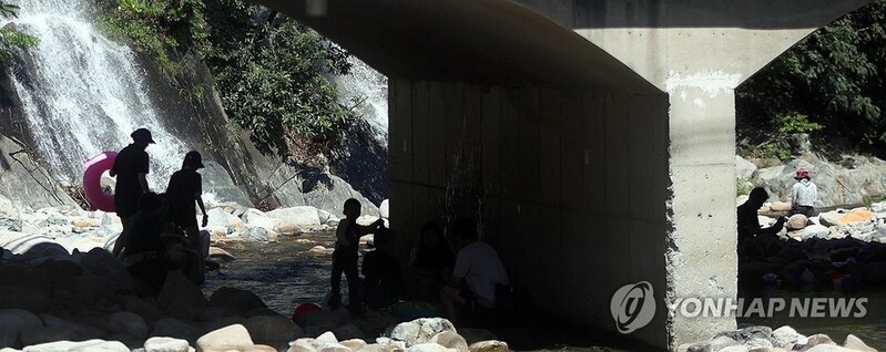 (김해=연합뉴스) 김동민 기자 = 전국적으로 폭염이 이어진 30일 오후 경남 김해시 대청동 장유대청계곡 내 그늘에서 피서객들이 휴식하거나 물놀이를 하고 있다.