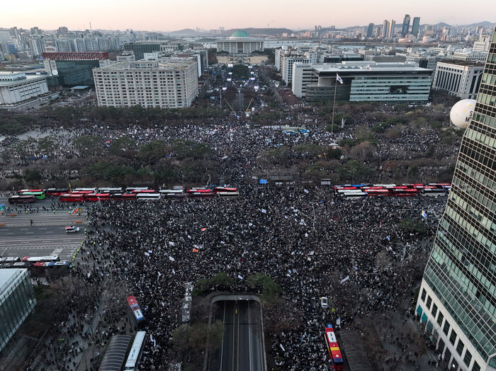 Protesters gather near the National Assembly in Seoul on Dec. 14, 2024, in support of an impeachment motion against President Yoon Suk Yeol. The motion passed with a vote of 204-85, including three abstentions and eight invalid ballots. (Yonhap)