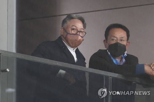 (서울=연합뉴스) 최인영 기자 = 프로야구 NC 다이노스의 구단주인 김택진 엔씨소프트 대표와 초대 사령탑 김경문 야구국가대표팀 감독이 한국시리즈(KS·7전 5승제) 현장을 직접 찾았다.
