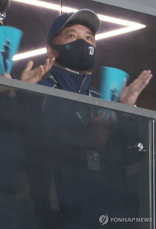 김 구단주는 NC 모자와 마스크, 점퍼를 착용해 선수단에 무언의 응원을 보냈다.