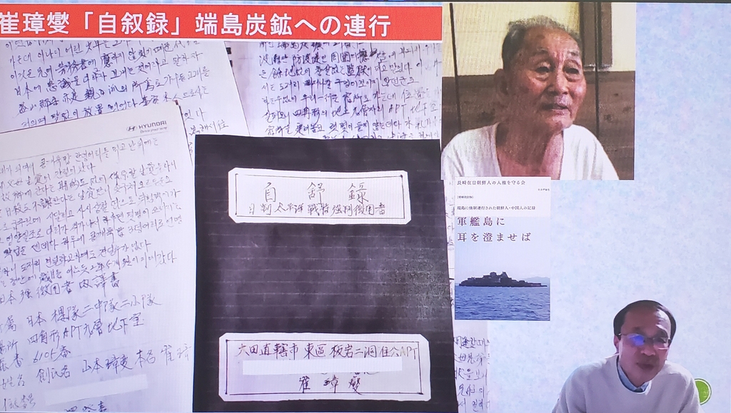 | ▲ 강연하는 다케우치 야스토 (도쿄=연합뉴스) 이세원 특파원 = 일제 강점기 역사 연구자인 다케우치 야스토(竹內康人, 화면 오른쪽 아래) 씨가 13일 오후 온라인 회의 시스템 '줌'을 이용한 강연회에서 일제 강점기 하시마(端島, 일명 '군함도')에 동원돼 강제 노역한 한국인 징용 피해자 등에 관해 설명하고 있다. 화면에 강제 노역 피해자인 최장섭(2018년 별세) 씨의 사진과 그와 관련된 자료가 함께 제시되고 있다. [줌 화면 재촬영, 재판매 및 DB 금지] |