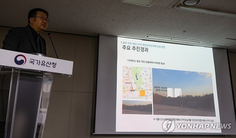 앞서 시가 세운4구역 고도 제한을 최고 141.9m로 완화하자 국가유산청과 여당은 종묘의 경관을 심각하게 훼손한다며 철회를 요구했다.