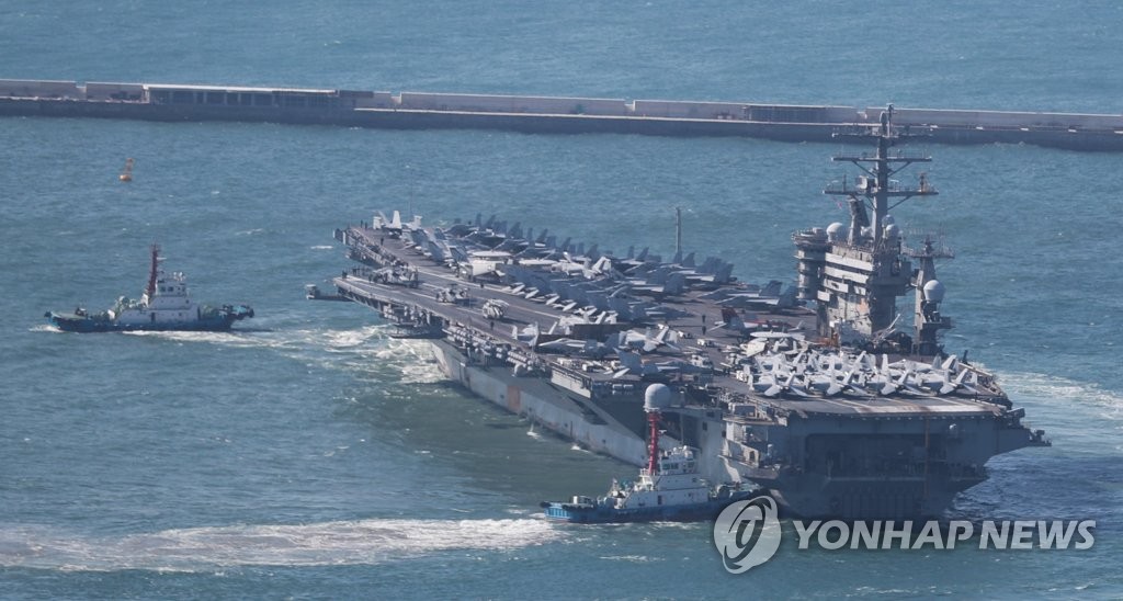 ▲ The U.S. Navy's nuclear-powered aircraft carrier USS Nimitz sets sail from a naval base in the port city of Busan, 325 kilometers southeast of Seoul, in this April 2, 2023, file photo. (Yonhap)
