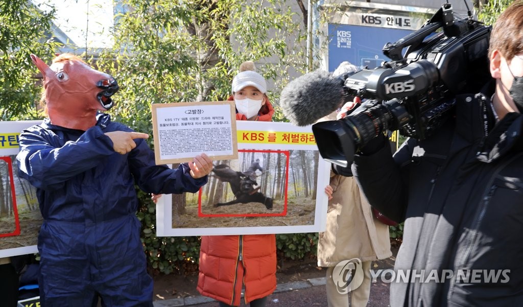 | ▲ 동물보호단체, KBS '태종 이방원' 동물학대 규탄 (서울=연합뉴스) 한상균 기자 = 한국동물보호연합 등 동물보호단체가 21일 여의도 KBS 본관 앞에서 '태종 이방원' 드라마 동물학대 규탄 기자회견을 하고 있다. '태종 이방원'은 낙마 장면 촬영을 위해 와이어로 말을 강제로 쓰러트렸다. 해당 말은 촬영 일주일 뒤 사망한 것으로 알려졌다. 2022.1.21 xyz@yna.co.kr |