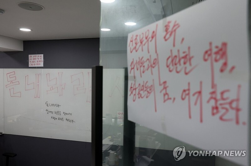 | ▲ Angry messages from victims are posted inside the headquarters of WeMakePrice in southern Seoul on July 29, 2024. (Yonhap) |