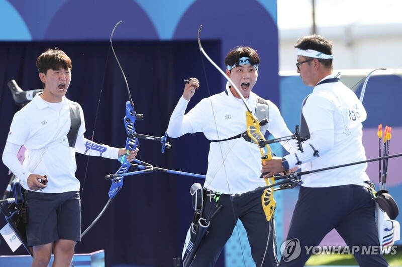 | ▲ Kim Je-deok, Lee Woo-seok and Kim Woo-jin of South Korea (L to R) celebrate during the final of the men's archery team event at the Paris Olympics at Invalides in Paris on July 29, 2024. (Yonhap) |