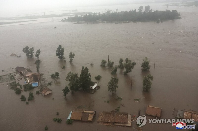 ▲ This photo, carried by North Korea's official Korean Central News Agency on July 29, 2024, shows flood-hit areas in Sinuiju City and Uiju County of North Phyongan Province due to recent downpours. (For Use Only in the Republic of Korea. No Redistribution) (Yonhap)
