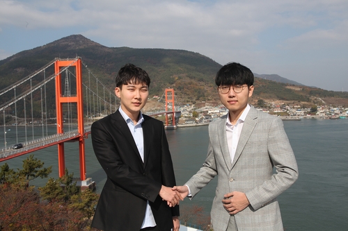 | ▲ 남해대교를 배경으로 악수하는 박정환(왼쪽)과 신진서 [한국기원 제공. 재판매 및 DB 금지] |