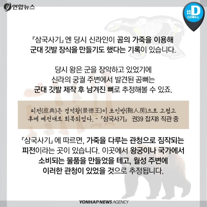 당시 왕은 군을 장악하고 있었기에 신라의 궁궐 주변에서 발견된 곰 뼈는 군대 깃발 제작 후 남겨진 뼈로 추정해볼 수 있죠.