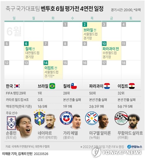 벤투호는 6월 2일 서울월드컵경기장에서 브라질, 6일 대전월드컵경기장에서 칠레, 10일 수원월드컵경기장에서 파라과이를 상대한다.