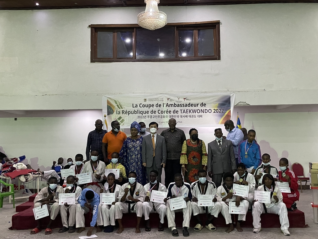 | ▲ 민주콩고 대사배 태권도 대회 수상자들 기념 촬영(뒷줄 왼쪽서 5번째 조재철 대사) [주민주콩고대사관 제공·재판매 및 DB 금지] |