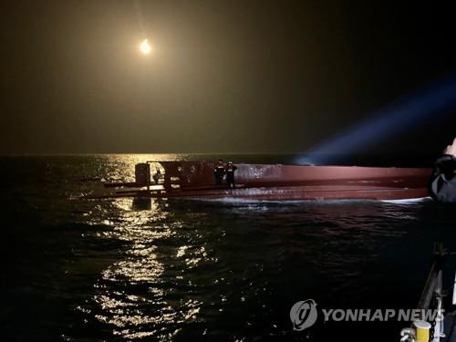It was reported at 11:19 p.m. Saturday that the 24-ton vessel had overturned in waters 16.6 kilometers west of the island of Daebichi, the authorities said. The uninhabited island lies some 20 km from the southwestern county of Sinan.