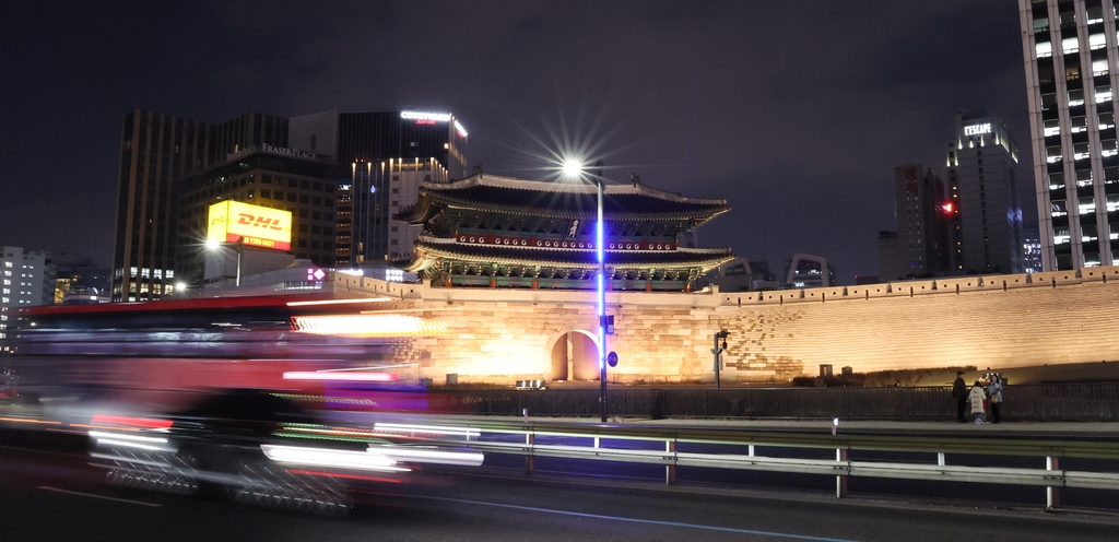 (서울=연합뉴스) 최재구 기자 = 2008년 숭례문 화재를 계기로 만들어진 '문화재 방재의 날'인 10일 서울 숭례문이 야간 조명을 밝히고 있다. 문화재청은 이날 야간에 숭례문 조명을 끄지 않고 다음 날 일출 때까지 계속 켜둘 방침이다.