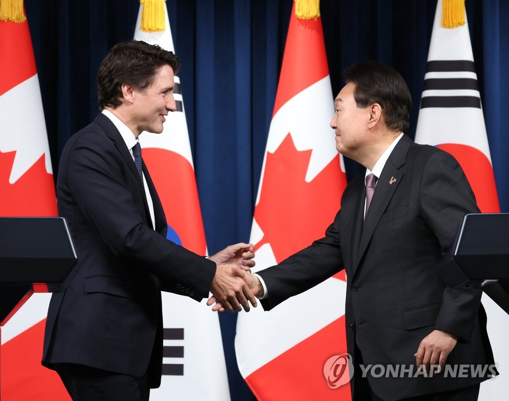The two leaders reached the agreements during a summit held a day after Trudeau arrived in Seoul on an official visit marking the 60th anniversary of the establishment of diplomatic relations between the countries.