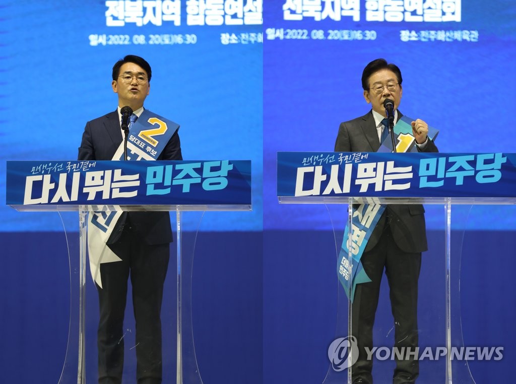 SEOUL, Aug. 20 (Yonhap) -- Rep. Lee Jae-myung, former presidential candidate of the main opposition Democratic Party (DP), won polls in North Jeolla Province on Saturday as part of an ongoing race for the new party leadership.