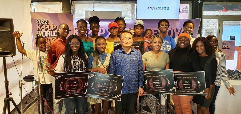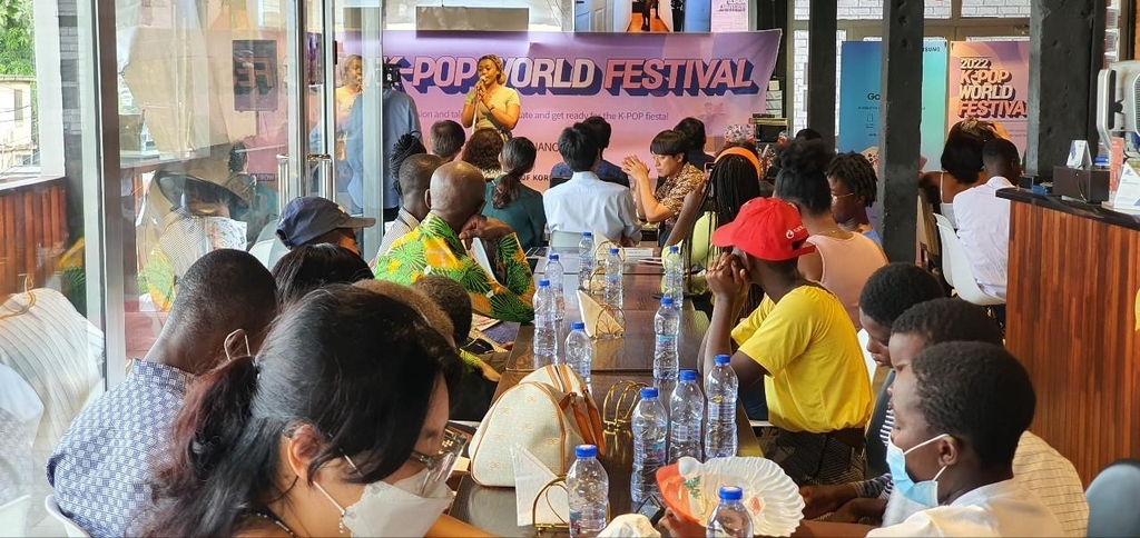 ▲ 주가나한국대사관(대사 임정택)은 지난 22일(현지시간) 수도 아크라의 한식당에서 '2022 K팝 월드 페스티벌' 지역 예선을 개최했다고 24일 밝혔다. 이번 예선에는 1차 심사를 통과한 총 9개팀(보컬 5팀, 댄스 4팀)이 참가해 아이돌 음악과 댄스부터 인기가요, 드라마 OST 등 다양한 분야의 공연을 선보였다. 부상으로 휴대폰을 받은 수상자들은 올 하반기 창원에서 열리는 본선에 참가하는 자격이 주어진다. (요하네스버그=연합뉴스)