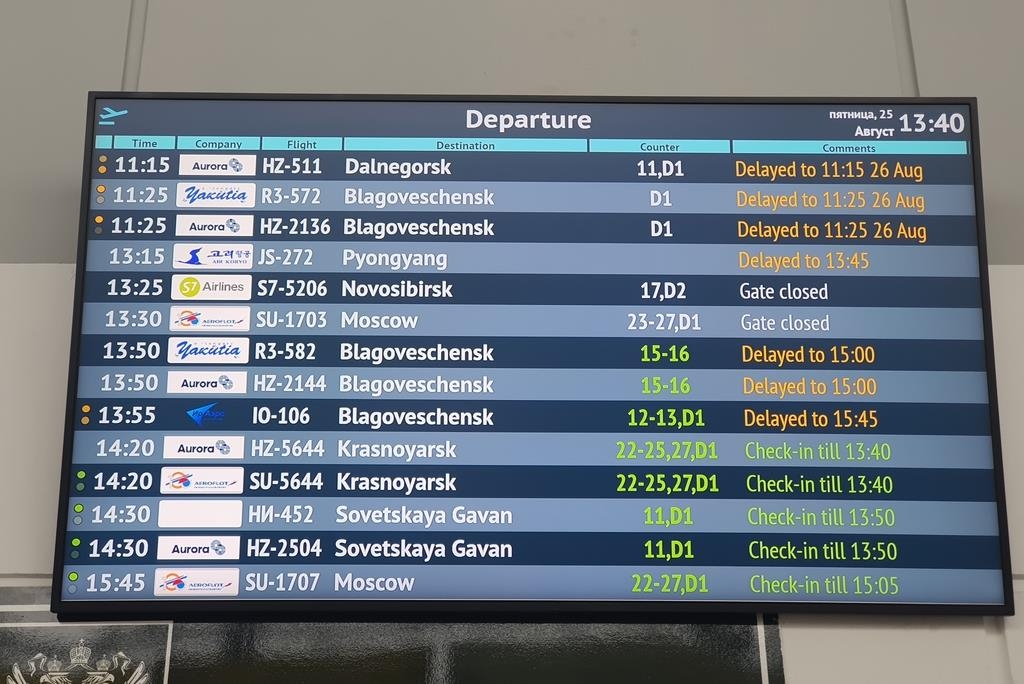 | ▲ The electric bulletin board at Vladivostok International Airport shows the schedule of Air Koryo's JS-272 flight on Aug. 25, 2023. (Yonhap) |