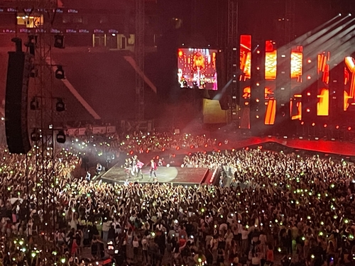 | ▲ 유럽 K팝 팬들 만난 엑소 카이 (프랑크푸르트=연합뉴스) 이율 특파원 = 엑소 카이가 무대에 오르자 독일 프랑크푸르트의 도이체방크 파크를 가득 메운 4만4천여명의 유럽 K팝팬들이 환호성을 지르고 있다. 2022. 5.14 |