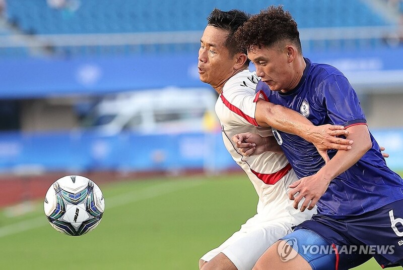 ▲ Kim Kuk-jin of North Korea (L) and Liang Meng-Hsin of Chinese Taipei battle for the ball during the teams' Group F match in men's football at the Asian Games at Zhejiang Normal University East Stadium in Jinhua, China, on Sept. 19, 2023. (Yonhap)