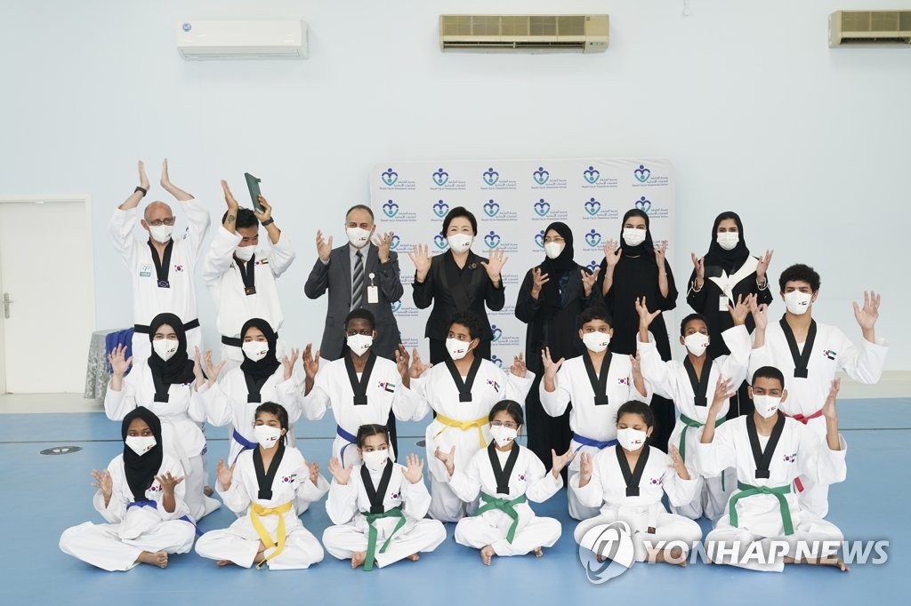 | ▲ 태권도 수업 참관 마친 김정숙 여사 (샤르자=연합뉴스) 서명곤 기자 = 김정숙 여사가 17일 오전(현지시간) 아랍에미리트(UAE) 샤르자 인도주의 복지센터에서 청각 장애인 태권도 수업을 참관한 뒤 교육생과 기념촬영을 하고 있다. 2022.1.17 seephoto@yna.co.kr |